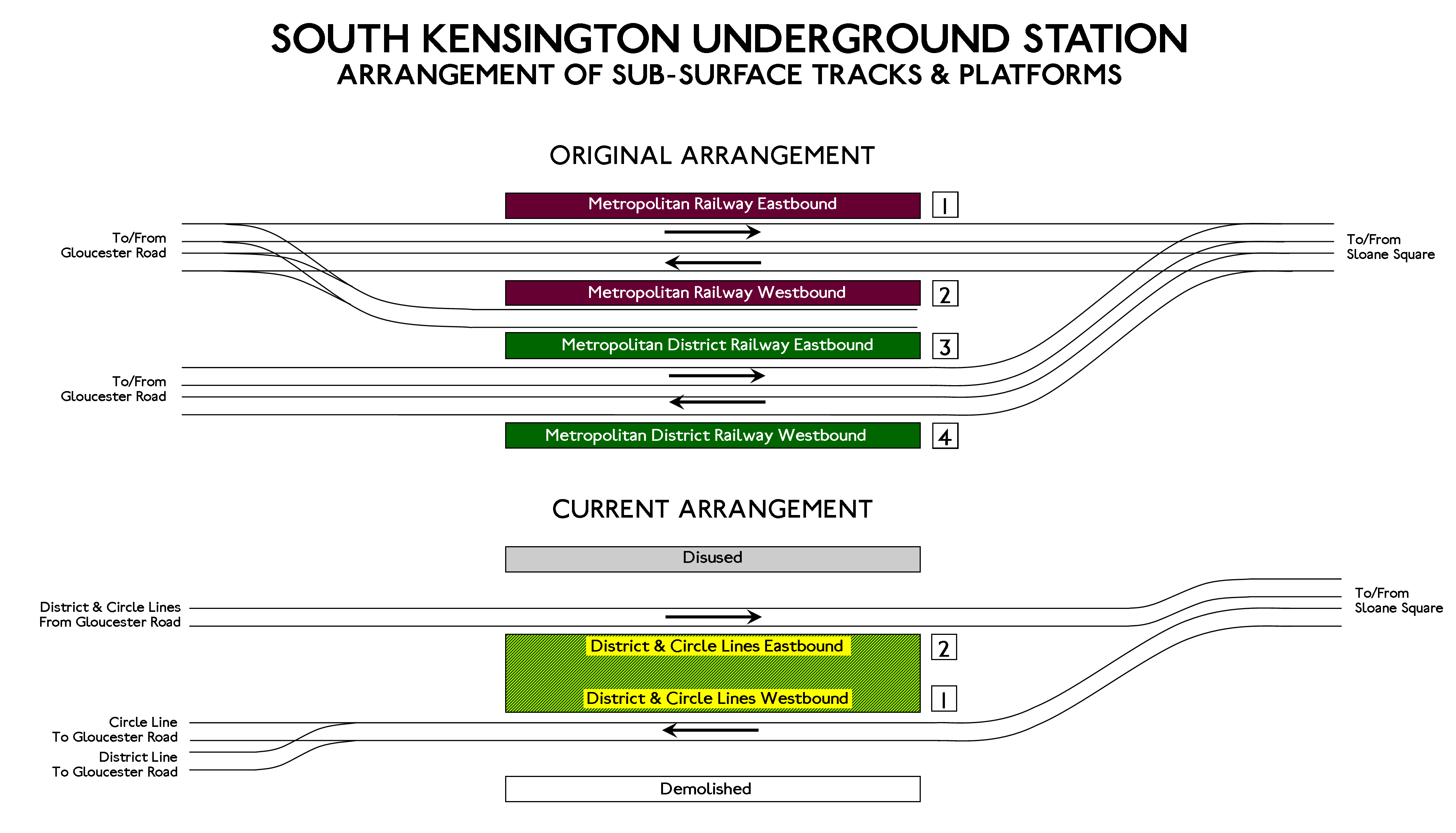 The layout of the surface level platforms is shown below. The image is by David Cane and is taken under the GNU Free Documentation Licence from this wikipedia website: https://commons.wikimedia.org/wiki/File:Layout_of_South_Kensington_station_platforms.png