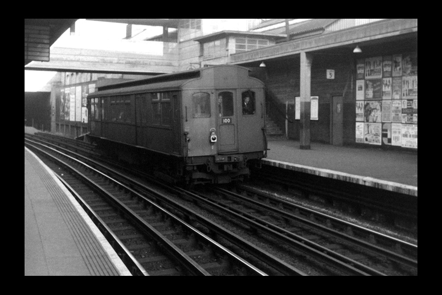 Starting at the Acton Town end: a view of platform 5 and the one-car shuttle that ran between Acton Town and South Acton, seen here c. Feb 1959. The photo was taken from platform 4.