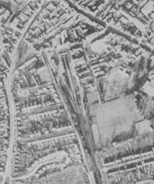 Aerial views from 1945 and 2010, both courtesy of Google Earth, distinctly showing the position of the station in relation to the area today. The station is more or less centre of the image. Move your cursor over the image to toggle between the images. |